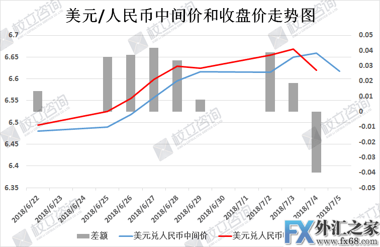 2018/7/5:美元/人民币中间价报6.6180,中间价下调415点。美元/人民币中间价大幅下调,收盘价处于中间价下方,市场上行出现受阻,短期可能进入区间震荡。