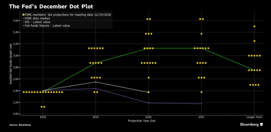即便如此,这一点图与公告中关于可以进行“若干进一步渐进式加息”的精神还是相符的。“若干”既可以把未来两年三次加息后暂停紧缩脚步的预期中值涵盖在内,而且如果事实如多数成员所料是2019年加息两或三次,那也不成问题。但是期货市场走势反映出的预期是明年最多加息一次。