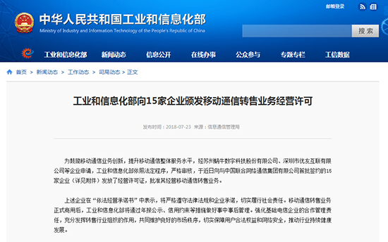 工信部发放经营许可证 小米、阿里等15家虚拟运营商“转正”! 2018年07月23日 16:53来源:第一黄金网 责任编辑:墨白今日(7月23日),中华人民共和国工业和信息化部官网,发布了《工业和信息化部向15家企业颁发移动…