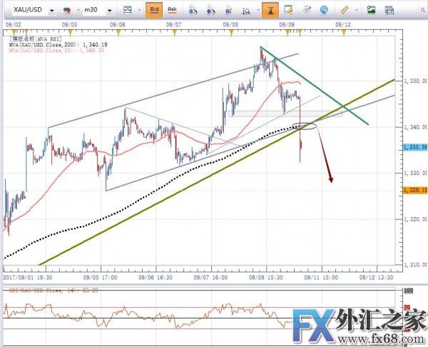 上图为黄金30分钟图 技术面利空因数 1)黄金位于1357高点下跌趋势中,目前位于1357-1332下跌波段内。 2)黄金跌破MA50均线1349和MA200均线1340,现报1336 3)黄金跌破了1350和1342重要关口。 4)RSI现价29,低于50,…