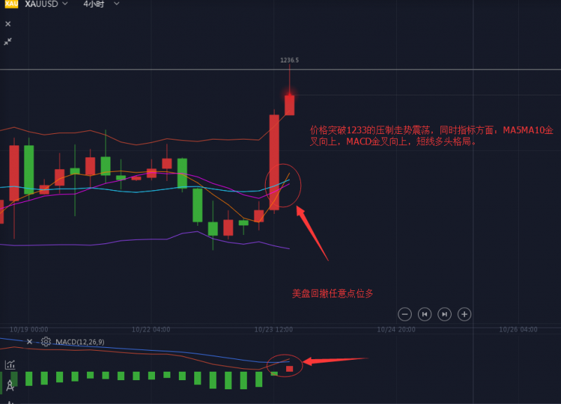 10.22消息面:周一(10月22日)亚市盘初,现货黄金震荡微涨,一度逼近1230整数关口,尽管上一交易日美元指数承压走弱,但更多的因素是市场对欧洲风险因素担忧情绪降温,也削弱了一些避险情绪;本交易日经济数据相对…