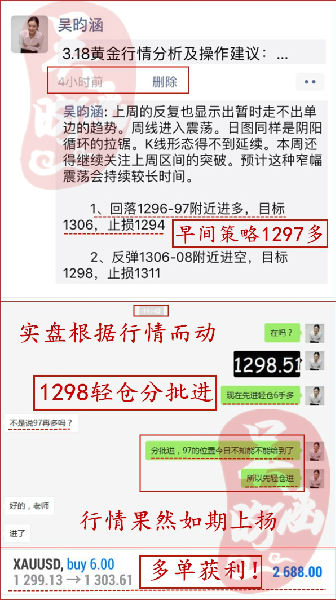 早间公众号就给出了1300的多单,(财经网站一般延后更新)给出的策略,1300的多的,已经获利减仓中,3.18黄金早间策略已经开始获利,跟上就是赚到早间公众号就给出了1300的多单,(财经网站一般延后更新)给出的…