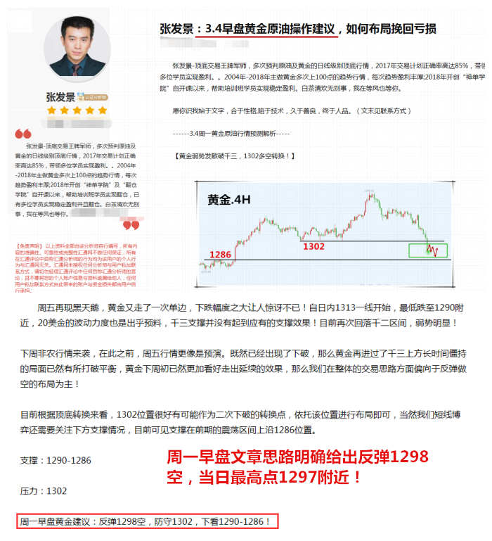 张发景-顶底交易王牌军师,多次预判原油及黄金的日线级别顶底行情,2017年交易计划正确率高达85%,带领多位学员实现盈利。。2004年-2018年主做黄金多次上100点的趋势行情,每次趋势盈利丰厚;2018年开创“神单学院…