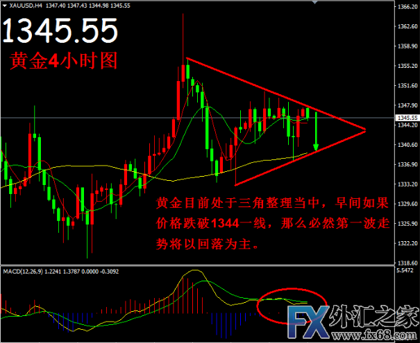 昨日黄金开盘在1345.5,早间价格小幅回踩,到达1343一线,之后冲高一波,最高上涨到1349.2,欧盘阶段价格再次走跌,一举破位1342支撑点,在美盘阶段最低下跌至1337.3,不过后半夜价格再次出现反弹,最终日线在134…