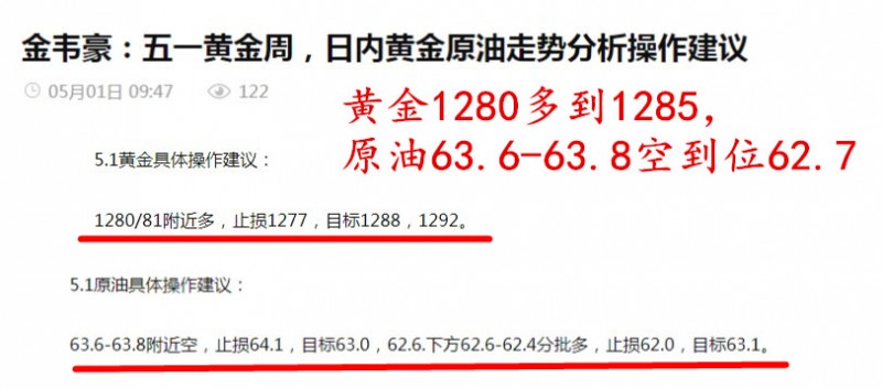 黄金原油再次精准布局!五月第一天,打响开门红,黄金白盘1280布局多单,美盘如期上涨1285获利收割!原油63.6-63.8布局空单,大跌62.8美元一线!大赚上千点!策略精准给力!再次横扫市场!还有谁不服?单单精准,单单上千点!大赚到你心服口服!韦豪分析和指导都是简单!精准!明了!没有任何的废话和模棱两可!就是让你做到,让你赚到!没有任何毛病!大家都见证!