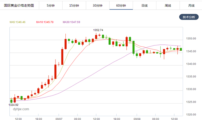 第一黄金网快讯: 周三(9月7日)亚欧盘中,国际现货黄金价格整体维持在1350美元一线窄幅波动,美盘时段,因投资者获利回吐和美元回暖的影响,黄金价格自1352美元高位转跌。周四(9月8日)亚市开盘后,金价在1350美元下方运行,目前交投于1345美元/盎司。