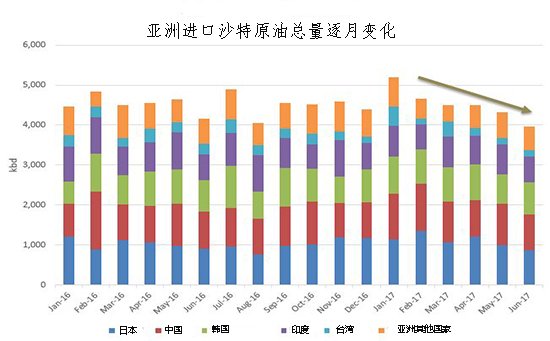 而OPEC原油出口量增加的主要消费地为包括中国、日本、印度以及韩国等在内的亚洲国家。而Clipper Data发布的报告显示,亚洲各国对于沙特的原油进口总量也在出现连续下滑。