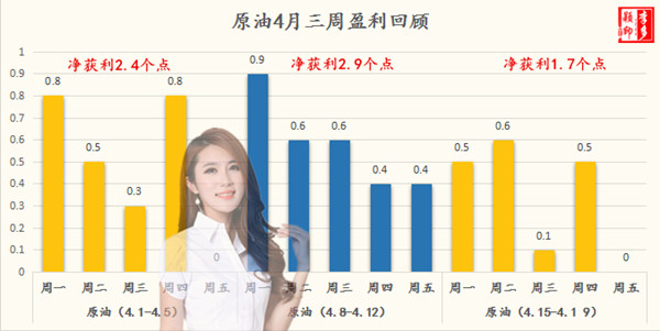 4月份的行情和交易已经过去大半,本月整体的收获还不错,数据说明一切,前期每周周评中都会有提到过,详情可看数据,具体交易复盘在前期文章中也有推送,可回顾以前文章查看。4月份已经过去的三周中,黄金净获利已经达到71个点,后面一周多的时间,继续稳健博弈布局,4月利润拿到百点利润也不是难事;原油净获利已经达到7个点(相当于黄金70个点!),那么在接下来时间里,继续稳健博弈布局,多颖会继续努力争取成绩更上一层楼!
