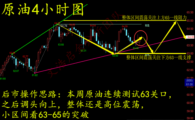 2、下方回调至63.4-63.6一线做多,止损0.4美金,目标看64.2-64.4一线;