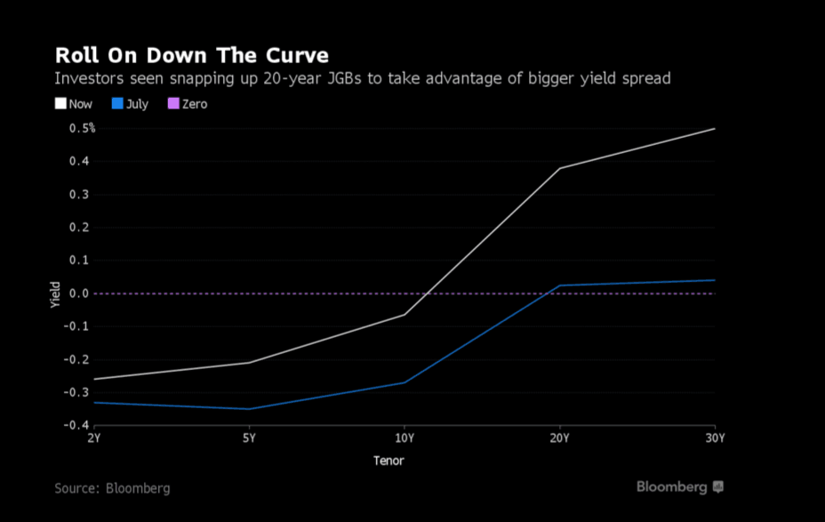 投资者纷纷买入20年期左右的债券以期从当前更大的收益率差中挣得回报,日本投资者今年的日子不好过。7月份,20年及以下期限的日本国债收益率皆已跌至零以下的纪录低点,投资者被迫转向更长期限的债券或投资海外以寻求投资回报。但是上个月趋势发生了逆转,投资者们预料到了日本央行政策重点向控制收益率曲线的转变,由此推动10年与20年期国债收益率差创出了3月份以来的最高水平。
