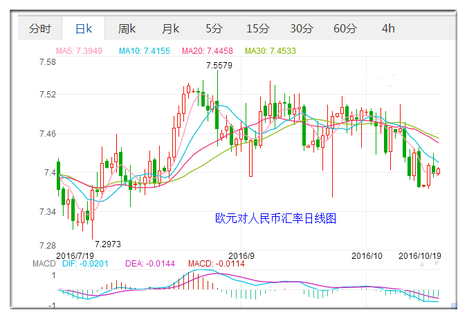 第一黄金网10月19日讯 今日欧元对人民币汇率持续震荡,近期欧元走势主要受德银危机的施压影响,欧元疲软下行,近期欧元汇率空头偏强势,日线仍运行于下行通道内,目前报7.4069。