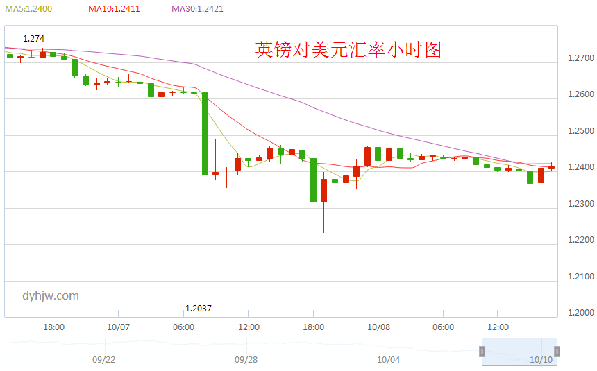 周一午盘,英镑/美元连续第三天走低,目前下跌0.1%,报1.2417美元。英镑/美元上周五(10月7日)亚市盘中曾意外闪崩至31年低位1.1821,数分钟内暴跌逾10%,令全球交易员“大跌眼镜”。