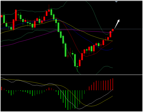 原油行情分析:原油日线延续多头走势,目前已经连续多日跃居60关口上方,因地缘局势的不断发酵加剧了全球原油供应短缺的风险,原油现正不断逼近65关口一线,如能再次突破则后市有望冲击去年高点。四小时MACD交金叉,红色动能柱缩减。同时Boll开口再度扩张,行情沿Boll带上轨运行,后市有望再度上攻。