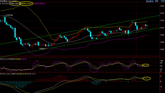从黄金4小时来看:震荡上涨后初步见顶;金价在1346-1280跌势的61.8%回撤位1321阻力附近受阻,KDJ初步结成金叉,MACD双线粘合,信号模糊短线变数较大,短线偏向上行,若失守布林带中轨1309附近支撑,则有望进一步跌向周四低点1303附近。上方初步阻力在1314附近,然后是1317附近阻力,若意外收复该位置,则削弱短线看空信号。下周上方关注1317;1321阻力;下方关注1309;1305支撑;操作上金诚建议择机低位做多,若下破1307,可以酌情参与空单。