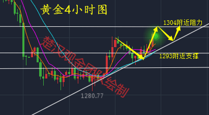 从黄金4小时来看:经过美盘的冲高,目前价格已经运行短期均线上方,其它各周期指标呈现多头排列,布林带整体向上开口,KDJ三线保持金叉形态向上延伸,由此理应偏向多头发展,不过,由于短期均线并未表现出明显的向上拐头,因此反向支撑可不会成立,加之MACD指标呈现向下放量形态,所以4小时级别整体不宜过分看涨。综合来看,今日操作思路上楚汉观金个人建议以回调做多为主,反弹高空为辅,上方重点关注1305-1308一线阻力,下方关注1292-1295一线支撑。