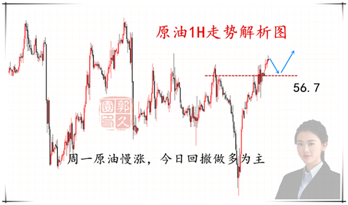 原油今日午后企稳56.8美金震荡上涨,虽然上涨的空间并不大,整体走的比较慢,但是趋势比较强势。短周期晚间原油下方关注56.9美金支撑,上方看57.8美金前期高点压力。