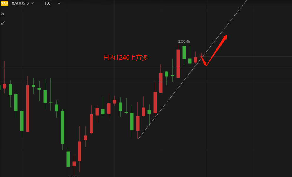 黄金方面首先自日线上行主通道下轨所有趋势线下轨节点支撑以来,前面子通道震荡整理行情全部被本次中继头肩底形态的上行突破,经过两日调整于昨日录得一根小实体阳线,前两日虽调整但并没有出现比较大的实体阴柱吞没阳柱,且修复5日线及10日线背离结构,日内区间仍在1240-1250一线,多头趋势依然保持,但仍需上破50给予持仓勇气。