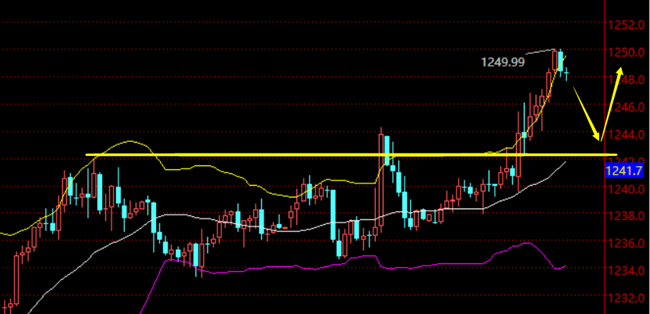 所以,在周一不要在高位买进多单,而是等回调之后再考虑入场,1245是回调支撑位,首次回调到1245,是一个非常不错的短线做多点。