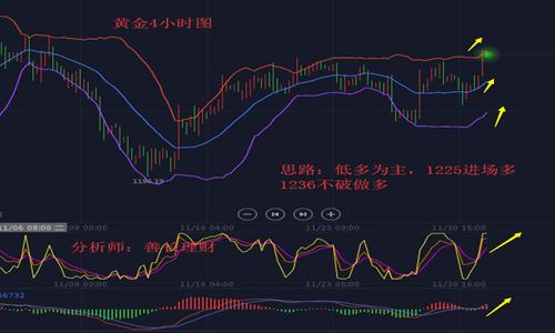 从4小时图上来看,在周五晚间美盘短线的下挫后以小阳线报收,周五美盘虽然最低触及1216.5附近,但是善长理财认为这只是虚破而已,目前4小时低点仍处于上移的,没有下破前期低点1211一线,今日持续震荡,以小阳线报收,在波幅上运行不大,所以下周初不要期待过大的回撤,不然会影响继续拉升的动能。今日短线操作上善长理财建议低多为主,高空为辅。上方关注1236一线阻力,下方关注1216一线支撑。