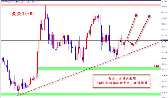 4小时方面,今早盘金价小幅回落触及1229附近后,企稳重回1230上方,这不仅体现出上移支撑的力度,且带动了短期均线向上拐头,加之sto双线呈金叉形态向上延伸,短周期指标呈多头排列,因此4小时级别来看多头占据优势。不过,有一点要注意,那就是布林带整体有意缩口,这意味着行情可能还会表现震荡,所以,我们也要做好金价再次上演冲高回落的准备。