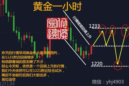而昨天的行情早间不仅在第一黄金网更新讲到,行情短期是个回调过程,既然是回调我们就可以在合适点位进多,那么黄金给的建议是1221附近进多入局,在朋友圈更新呢就是1223附近进多入局,当然,不管在什么点位我们都是盈利了。微信:yhj4903