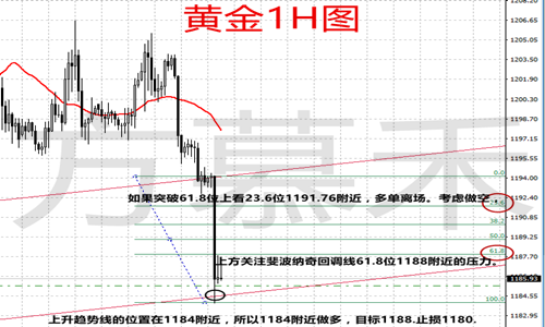 那么以1191.76为这一波行情的高点,以1182.57为这一波行情的低点。再来斐波纳奇回调线分析一下今天欧美盘的走势。如下图: