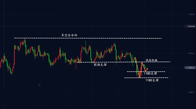 4小时走势来看,震荡下行走势之后,后市行情怎么走,这也是近期需要重点关注话题,连阳走势无延续,下跌走势无反抽,当然4小时需要重点留意1193前期下跌口,这也是今日布局空单比较理想点位,短期均线指标MA5明显上穿MA10日均线位于0轴上方运行,配合附图指标MACD金叉持续放量,4小时看好震荡上行走势。从小时线走势来看,三连阴之后,如果行情给出反抽,切记不是反转信号,除非是大阳线,连续那一种,破前期高点不回撤,当然短期价格给出回撤,不要急着做多,等待趋势明朗在布局,虽然短期均线指标MA5明显下穿MA10日均线位于0轴下方运行,配合附图指标MACD死叉放量,小时线看好震荡下行走势,综合近期走势来看,今日上方重点关注1193-1196阻力位,下方重点关注1184-1181底部支撑,操作方面反抽布局短线空,回撤做多为辅。