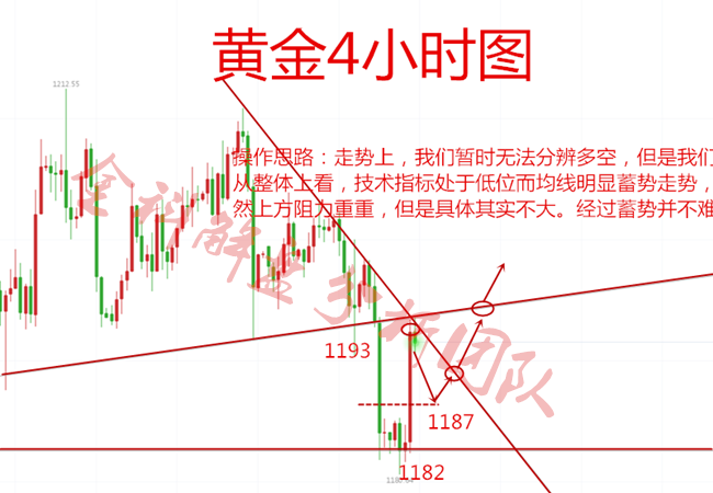 我有一语可定行情走势,我有一言可解锁仓之单,我之问,问市场变换莫测何以自处;我有一计可于中线止盈,我有一策可令解套无损,我之答,答亏损之后如何翻仓回本!靓丽的行情千篇一律,精准的策略万里挑一;我是金科解盘,我为客户代赢!“明者则跟,疑者则弃”!上周五收大阳有效企稳1190,预示多头有效展开反攻,接连周初两日碎阳上行,操作上给到一定指引,肯定是不能盲目追空操作的,当然在大环境的影响下,前期连跌单边下行,也有许多朋友被套于1200下方。为什么现在迟迟不肯出局,究其原因也就是亏损太多不愿意止损,侥幸心理认为这只是大回调之前给到的小修正,然而等待下一周之后,非农数据之后,你就会明白这是空单最后的出局机会,止损顺势而为还有回本的机会,打算犹豫吗?很多人都说喜欢看金科的文章,因为行情分析的简单明了,观点思路给的恰到好处。与其吹嘘自己做的不好,不如帮投资者解决最实际的问题。金科今天再说说后市操作思路!