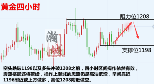 瀚城老师的意思就是黄金,在空头跌破1198以及多头冲破1208之前,四小时区间操作依然有效,震荡格局还将延续,操作上瀚城老师的思路仍是高沽低渣,早间靠近1198附近或上方开多。
