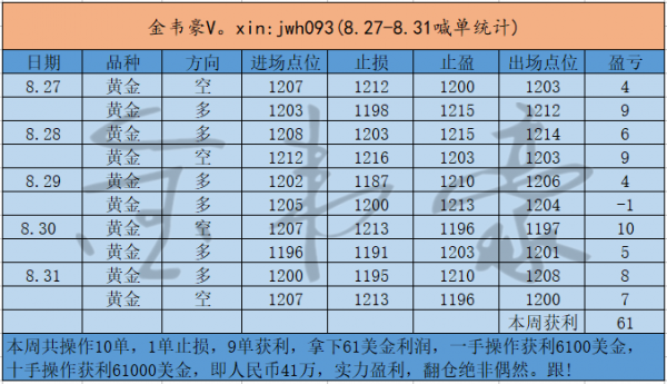 老规矩,首先跟大家通报下我们本周战绩!共操作10单,9单获利,1单亏损,正确率90%,获利61点,以一万美金一次用十分之一仓位操作一手,则收益6100美金,10万美金一次用十分之一操作10手则收益61000美金,一周收益率61%。