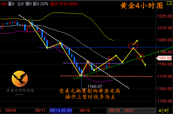 4小时图上黄金至1160反弹上来低多逐渐走高,短期内表现出良好的多头反弹趋势,周五尾盘黄金受美指抛售的压力突破1180附近阻力线,打开了黄金上行的第一阻力位,那么接下来我们操作上暂时以低多为主,高空为辅。上方阻力先关注1195附近阻力,下方关注1180附近支撑;