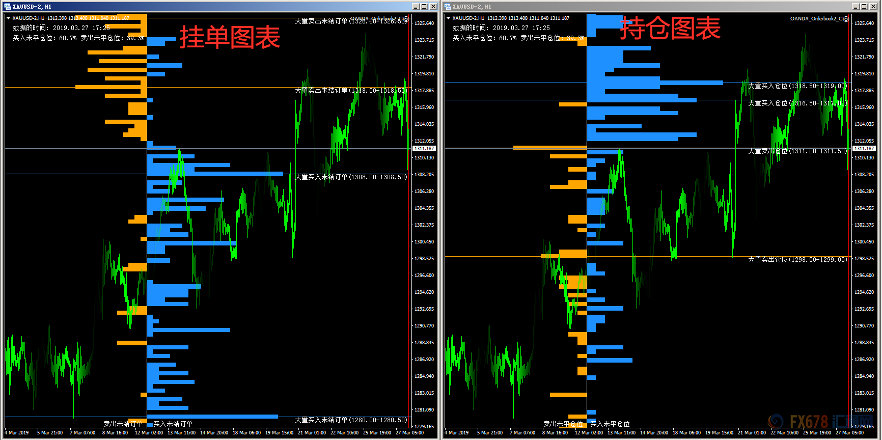 OANDA(安达)最新挂单图表显示,目前多空持仓比例大约是--多头:60.7%,空头:39.3%。后市仍倾向上行。上方1326.00/50和1318.00/50附近存在较多卖出挂单,下方1308.00/50和1280.00/50附近存在较多买入挂单。