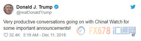 周二(12月11日)' 美国总统特朗普暗示,将就中美贸易谈判发表“重要声明”。他在推特上写道:“正与中国进行一些富有成效的对话!关注一些重要声明!”