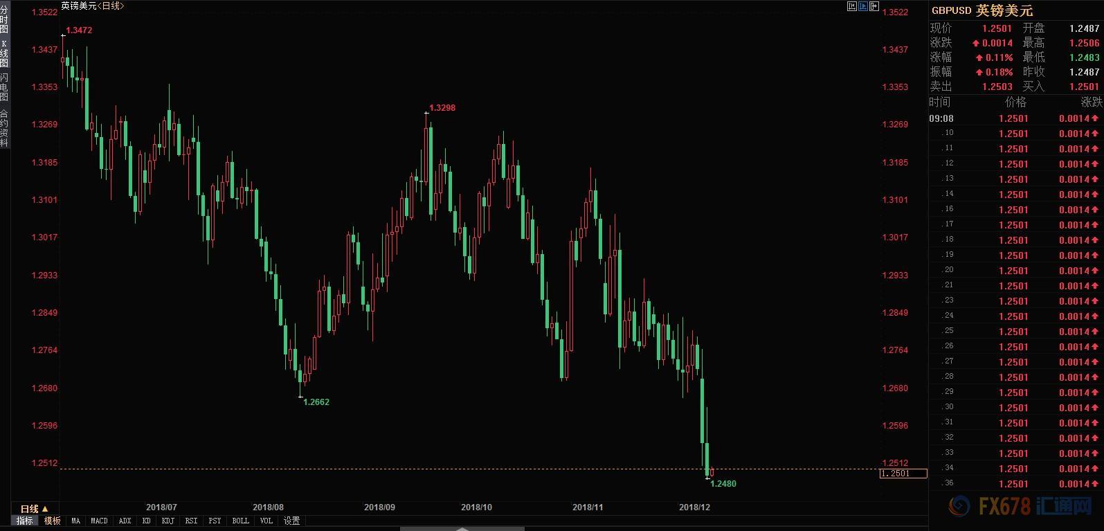 英镑受到脱欧不确定性因素,连累一度跌至20个月低点1.2480。