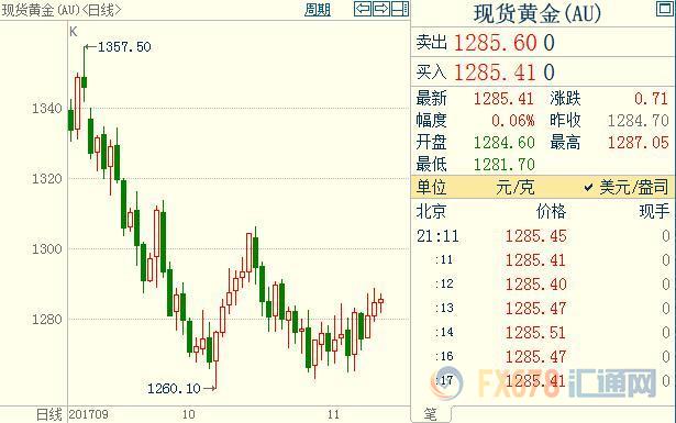 周五(11月10日),现货黄金围绕在上个交易日高点附近展开整理,' 美元指数盘中则刷新了10月26日以来低点至94.389。上个交易日,因' 美国参议院共和党人提出的税改议案令人失望,导致美元大跌,黄金刷新10月20日以来高点至1288.52美元/盎司。从目前的情况看,美国参众两院要想在今年圣诞节之前达成妥协,最终生效税改法案的可能性相当渺茫,美元未来上行动能有限,黄金价格将获得持续提升。