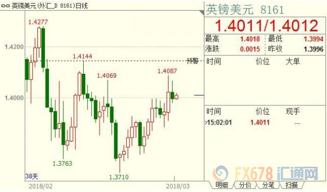' 英镑美元微升0.09%至1.4008。上个交易日,在数据显示' 英国2月通胀放缓程度大于预期之后,英镑脱离周一所及的2月16日以来高点1.4087。不过这无法撼动英国央行本周可能暗示最早在5月升息的市场预期。