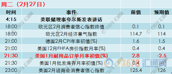 未来一周是数据密集公布的一周,其中包括多国消费者信心、贸易收支、PMI数据等,投资者可望从中研判经济增长和利率政策前景。' 美联储数位官员的讲话也是关注重点,而重头戏将是美联储新任主席鲍威尔在国会发表上任后的首次证词陈述,市场可以从中可一窥其货币政策立场。此外意大利' 大选也将临近,或将对' 欧元下周走势产生一定的影响。