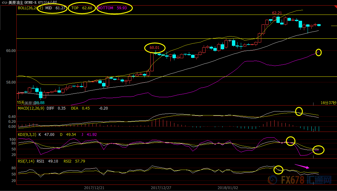 从4小时图来看,MACD死叉运行,油价短线偏向下行,油但价仍然受到布林线中轨的支撑,目前在61.27附近,需要跌破该位置,才能打开进一步回调空间,布林线下轨支撑目前在59.93附近。