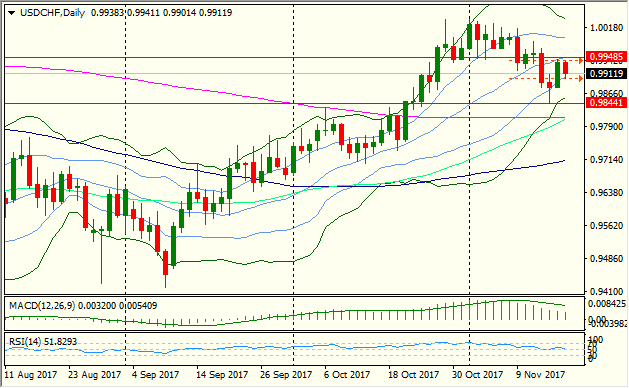 美元兑瑞郎震荡回落至0.9901,汇价仍延续此前震荡下行趋势;