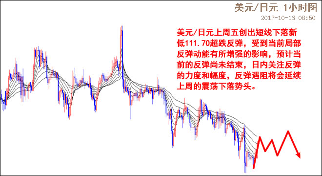 美元/日元中期反弹到113.45遇阻回调,从4月18日开始的横盘震荡势头持续。从小时图走势来看,美元/日元10月6日至今一直以震荡下落局面运行,美元/日元短线下落过程中一直以主次节奏交替的格局运行,短线下落过程中的延续性有所好转。美元/日元上周五创出短线下落新低111.70围绕低点有构筑新的次要节奏的迹象,有助于短线跌势的持续。受到美元/日元当前局部反弹动能有所增强的影响,预计当前的反弹尚未结束,日内关注反弹的力度和幅度,反弹遇阻将会延续上周的震荡下落势头。关于动能的分析,可以参考一杰老师实战进阶班的动能分析和交易视频课程。短线阻力112.25,112.60;支撑111.40,111.00。