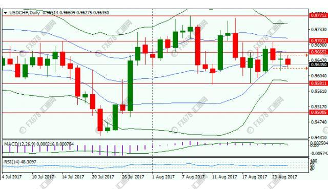 美元兑瑞郎亚欧时段震荡承压,刷新日低0.9637;时逢杰克逊霍尔央行年会,汇价波动性下降,承压于20日均线;日内聚焦耶伦及德拉基讲话。