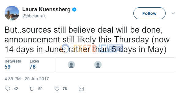 根据BBC政治编辑Laura Kuenssberg的推特,英首相特雷莎梅可能在周四与北爱尔兰民主统一党达成协议,后者将支持其组建政府。