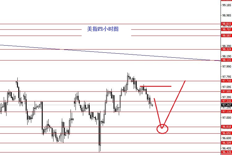 美指上周正如预期小幅反弹后受阻回落,周图收小阳柱。从图形来看,美指反弹还是比较弱,中长线后市还是看跌,而本次的反弹或低位修整行情是否完结还不确定,所以本周继续按低位震荡格局操作,周初在97.60没成功上破前,做空美指,下方关注96.80-96.70区域强支撑,若得以支撑继续向上反弹的概率较大,月底前下破96.70的概率偏小。今日操作建议:97.35区域做空美指,止损97.60,目标看向96.80/96.70区域。再次给出向上信号后再多美指,控制仓量,严格止损。