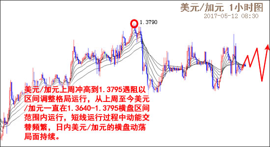 美元/加元中期上行到1.3795遇阻围绕高点有构筑新的次要节奏的迹象,有助于中期涨势的持续。从小时图走势来看,美元/加元上周冲高到1.3795遇阻以区间调整格局运行,从上周至今美元/加元一直在1.3640-1.3795横盘区间范围内运行,短线运行过程中动能交替频繁,日内美元/加元的横盘动荡局面持续。美元/加元经过近期的连续调整后涨势持续。