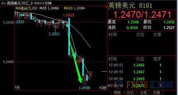 汇通财经易汇通软件显示,北京时间17:40,英镑兑美元报1.2465/66。 【免责声明】本文仅代表作者本人观点,与汇通网无关。汇通网对文中陈述、观点判断保持中立,不对所包含内容的准确性、可靠性或完整性提供任何明示或暗示的保证,且不构成任何投资建议,请读者仅作参考,并自行承担全部风险与责任。