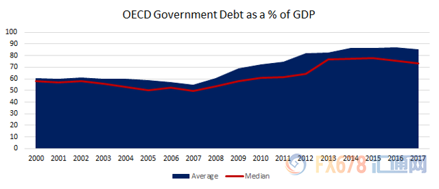 外国央行为何增加黄金储备的原因当然值得商榷,从35个国家OECD数据库中得到的政府债务占GDP百分比的数据显示,在过去十年里,整体的杠杆率显著增加,这种趋势不仅仅是反映在部分极端的例子中,平均值和中位数也有所体现。