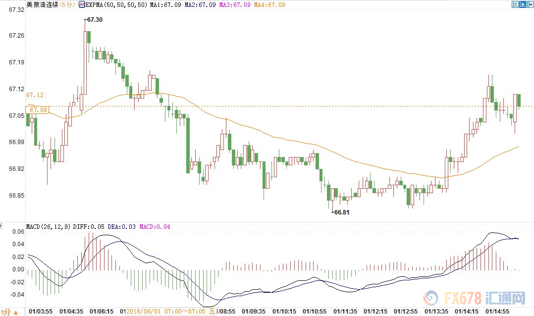 美油在亚洲时段整体于盘下弱势整理,但在欧市盘初反弹,现交投于平盘67美元一线。前一交易日出炉的美国上周EIA' 原油库存录得大降,一度提振油价。但美国原油产量延续上升趋势,使得提振力度受限,油价于此后回落。