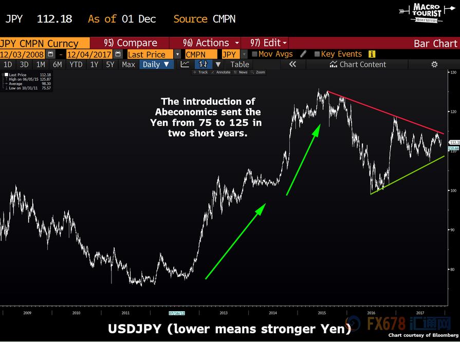 在安倍经济学的最初几年,日元确实走软,而且是幅度很大。安倍经济学的引入让日元兑' 美元在短短两年内从75跌至125。