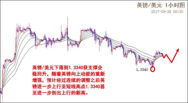 英镑/美元创出中期新高1.3660遇阻回调,上一个交易日英镑回调到1.3340获支撑企稳回升,随着英镑向上动能的重新增强,预计英镑经过连续的调整涨势持续。从小时图走势来看,英镑/美元9月20日上行遇阻一直以震荡下落局面运行,上一个交易日英镑下落到1.3340获支撑企稳回升,随着英镑向上动能的重新增强,预计经过连续的调整之后英镑进一步上行至短线高点1.3340甚至进一步创出上行的新高。短线支撑1.3340,1.3300;阻力1.3460,1.3520。