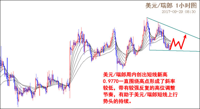 美元/瑞郎日线图反弹到中期关键阻力0.9770遇阻反弹力度放缓,美元/瑞郎受到6月15日至今动能交替频繁的影响,中期的动荡势头持续。从小时图走势来看,美元/瑞郎周内创出短线新高0.9770一直围绕高点形成了斜率较低,带有较强反复的高位调整节奏,有助于美元/瑞郎短线上行势头的持续。受到最近几个交易日美元/瑞郎创新高力度放缓以及中期的阻力作用,美元/瑞郎短线创新高的力度有限。短线支撑0.9680,0.9640;阻力0.9740,0.9770。